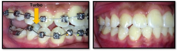 One of the best ways that I explain to our patients when it comes to braces is by telling them to imagine that they have a couple back teeth taken out. When this happens, the jaw bone (condyle) will actually now go deeper into the socket and can pinch the protective disc on the top of the condyle. Now let’s think the opposite way- if you were to grow the back teeth just a bit taller, this would create more room for a disc that might be out of place (which happens with so many people). So what I like to do is to take an xray and determine the position of the condyle in the socket and see if it looks like there is enough space for the disc on each side. If it looks like we could use a bit more space, then I will do the braces like you see below in the picture. Notice what I call the ‘turbo’- a plastic buildup that creates a ‘fulcrum’ or lifting point. The wire is straight when placed into the brackets and it will tend to erupt those back teeth which will provide more support for the TM joints.