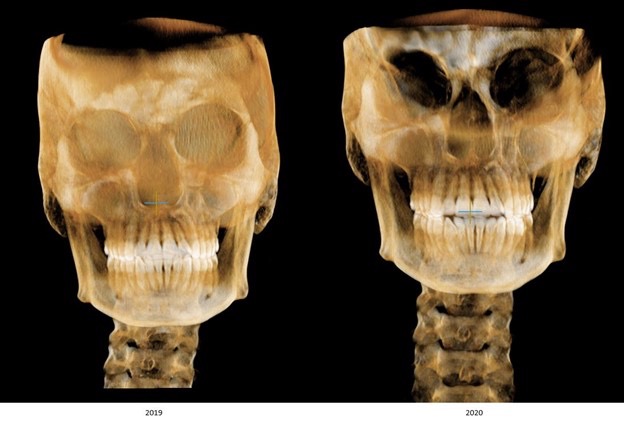 You see, dear reader, I believe the dystonic starter event began many years ago. It is possible that a slight accident or hit to the jaw could have ‘popped’ the disc out of place and this is now causing the skull to tip to the side, which then pulls on the neck. Please check out the xray below of one of our cases. This patient was not even diagnosed with dystonia, but I believe we can call this perhaps a ‘pre-dystonia’ patient. When I met her, her complaints were head and neck pain. The MRI showed definitive displacement of the jaw joint discs. We treated the discs and cranial bone displacements for about a year and as you can see in the xray on the right, she now lines up a lot better.